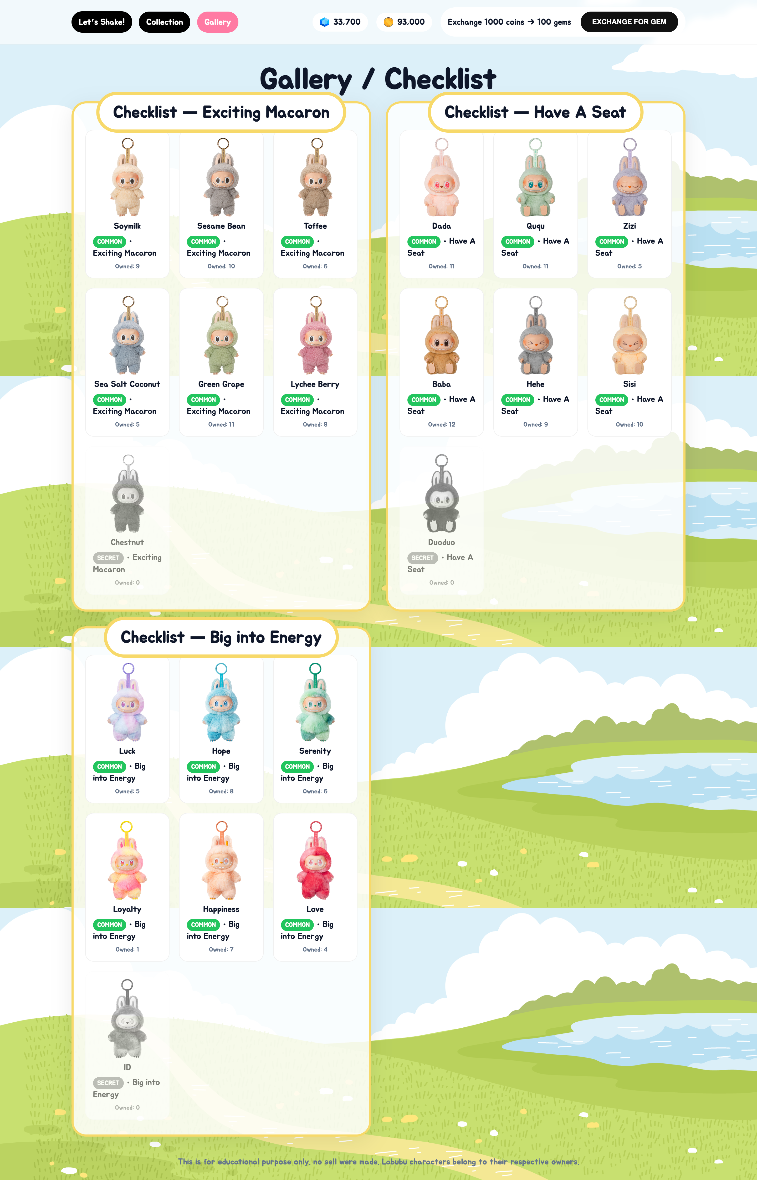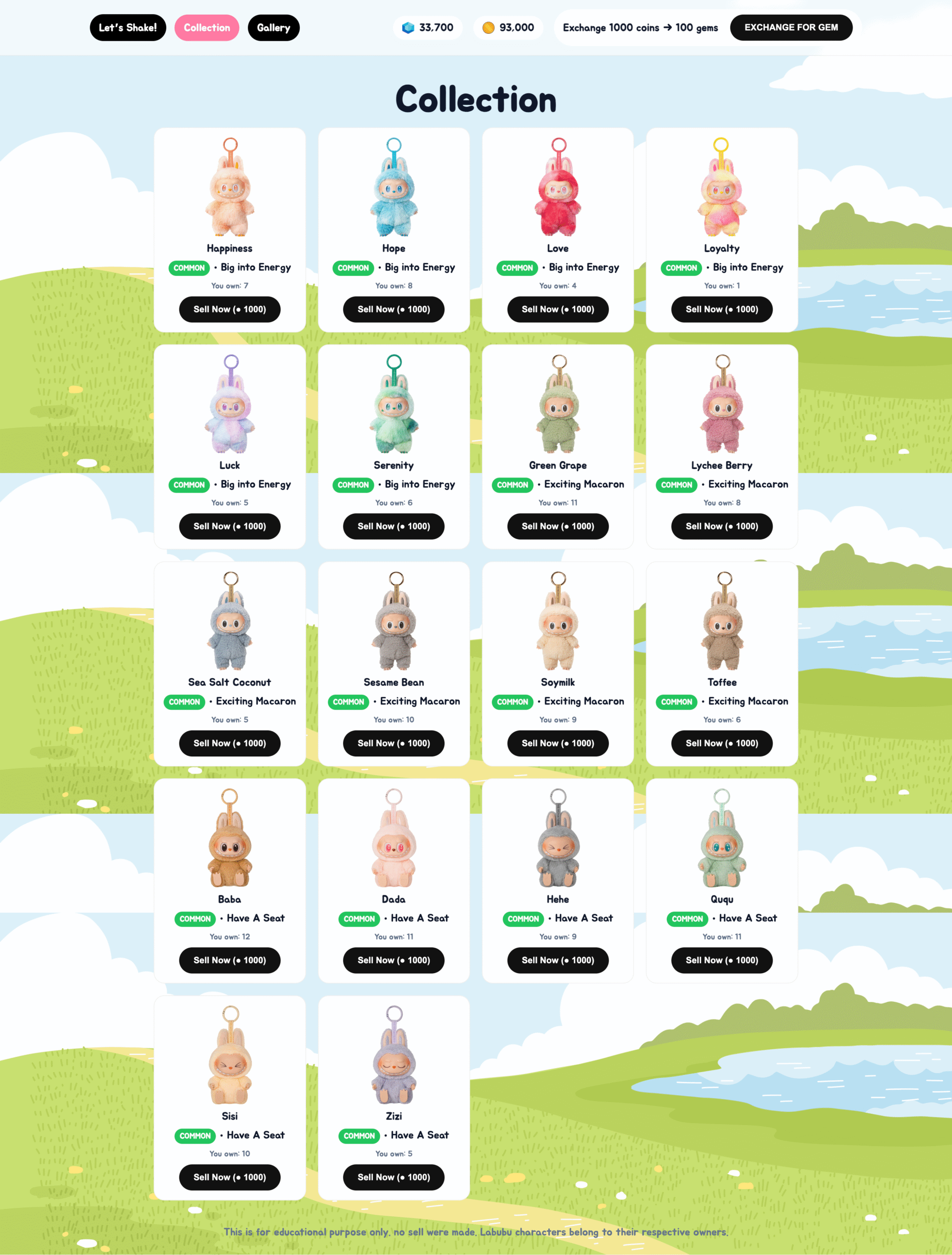 Collection page to store the Labubu you’ve “opened,” with ability to sell them back for coins.